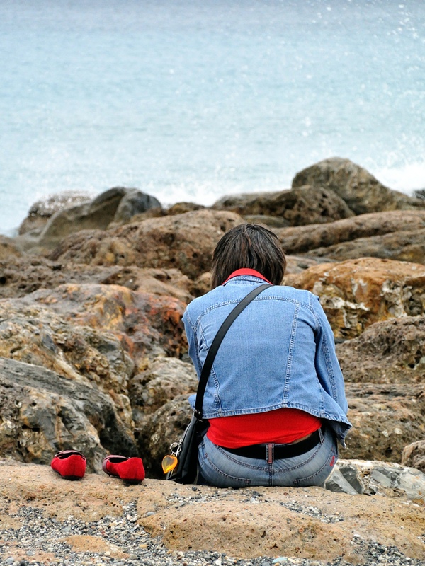 A me sembrano i colori il tratto saliente di questa foto. Il rosso innanzitutto, ma anche il celeste dei jeans e del mare con la chicca del cuoricino giallo. Credo che un formato quadrato ed una rinforzatina al mare (come da esempio che mi permetto di inserire) avrebbero potuto valorizzare questi aspetti.