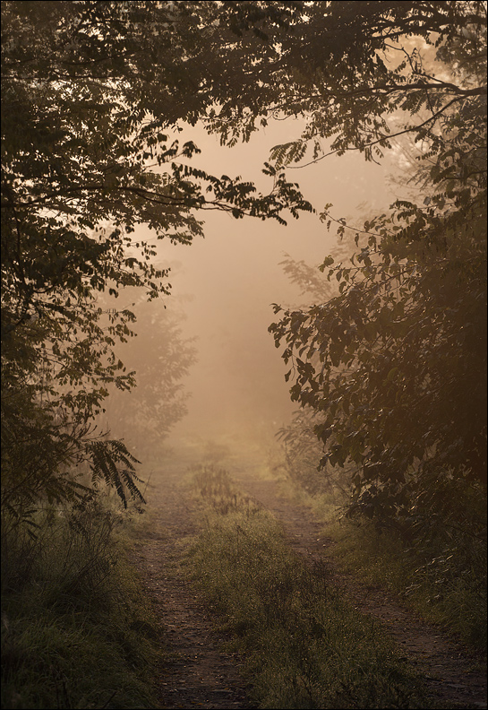 No, secondo me una persona nella nebbia non è' necessaria a sottolineare il mistero di questa stradina di campagna. Gli ingredienti ci sono tutti: la magia della luce, la cornice naturale delle fronde, il degradare della visibilità, i colori delicati del sole che va a morire (mi piace pensarla al finire di una giornata).