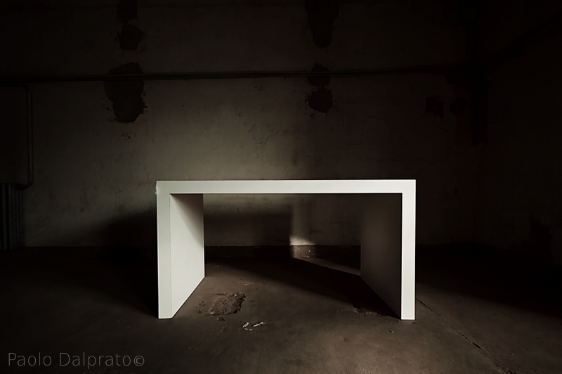 Il posto che ho fotografato è una fabbrica quasi del tutto dismessa (sono ancora parzialemnte attivi degli uffici ed una parte di magazzino), abbiamo trovato questo tavolo, completamente fuori luogo, e come era l'ho fotografato, cercando di mettere in orizzontale il piano, "lasciando" andare il resto anche per marcare ancora di più le differenze. Il tubo sulla parete è storto di suo, probabilmente è qualcosa messo quando il capannone era già stato svuotato. E' un posto particolare, è stato anche un set di film e spot (ad esempio ci hanno girato una parte di "ladri di saponette" di Nichetti), pr cui ci sono tracce di lavori volanti e forse questo tavolo arriva da questa strana attività.