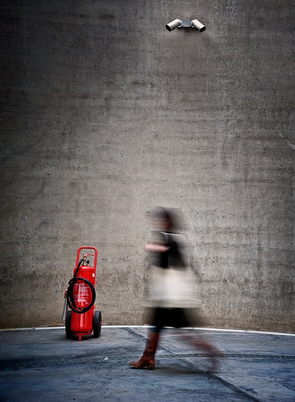 mi piace come é costruita la composizione, i tre elementi: il soggetto mosso, le telecamere appese, l'antincendio a rotelle, sembrano stiano per dirsi qualcosa, però lo spazio sopra del muro li sovrasta, li ammutolisce e li ricompone.