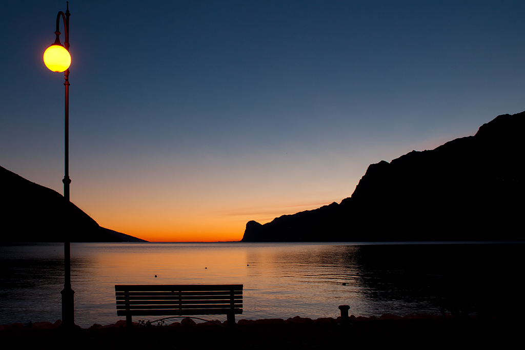 I colori tipici dell'imbrunire che si contrappongono ai toni caldi del lampione e agli ultimi bagliore di luce rendono un contrasto cromatico particolarmente accattivante.