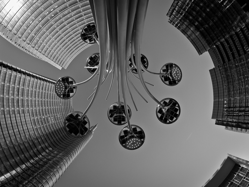 Un 8mm è sempre una grossa sfida. Promette e permette tantissimo, ma non concede un mm di sconto in composizione. Due degli elementi della struttura centrale intersecano la barriera di grattacieli. Non è cosa spiacevole, ma provo a pensare all'impatto che la foto avrebbe regalao se i petali fossero stati al centro esatto del cielo libero. Bianco e nero particoalre , ma a mio aprere niente affatto spiacevole, dati i molti punti di brillantezza che spiccano su di un contesto difficile da esporre. Passeranno esperti della sezione a datrti consigli più tecnici, ma personalmente trovo la foto più che riuscita.