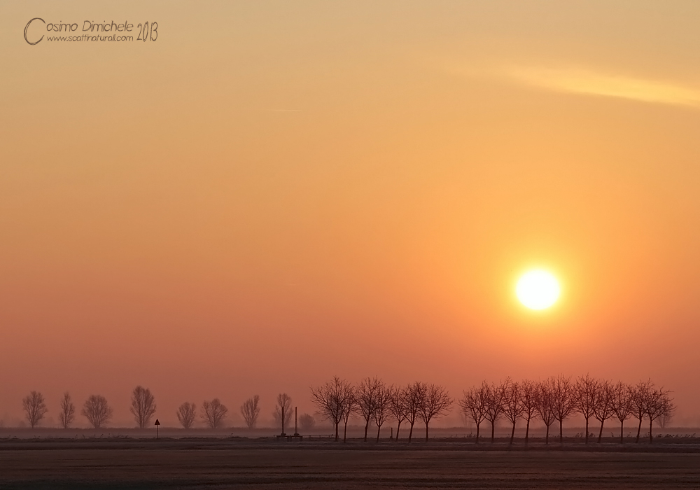 Quel sole riesce ancora ad abbagliare persino in foto... I colori e la composizione sono oltremodo gradevoli, ma quell'astro cattura si di sé tutta l'attenzione rubando un po' la scena ai bellissimi filari di alberi..opinione strettamente personale naturalmente..
