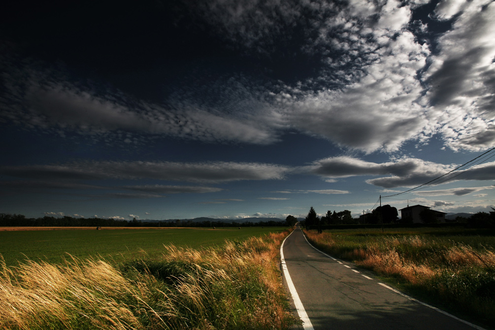 molto reale il trattamento dei colori, la strada prosegue con buona fuga (hai fatto anche accortenza a far cadere la striscia destra in corrispondenza dell'angolo in basso a destra), linea dell'orizzonte a un terzo basso ... insomma un buona immagine in cui non hai preso nessun rischio, e ci sta.