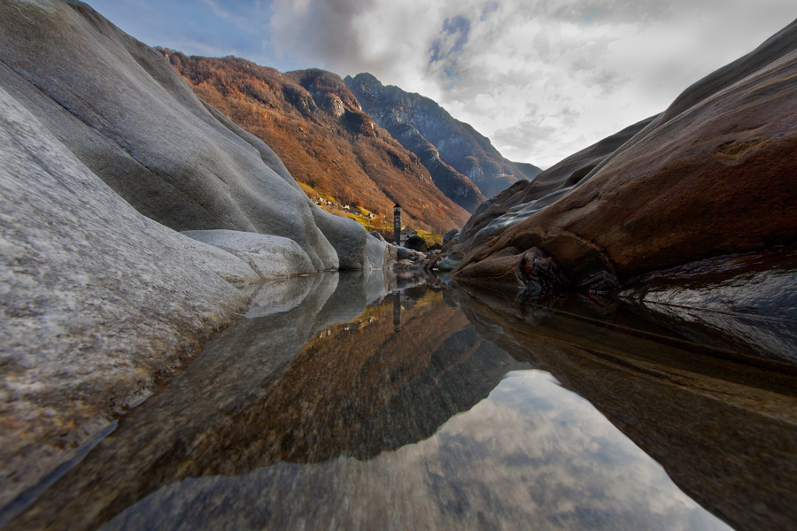 Composizione eccellente ad enfatizzare le simmetrie, con le linee di fuga che portano diritte alla chiesda ed al campanile di Lavertezzo.