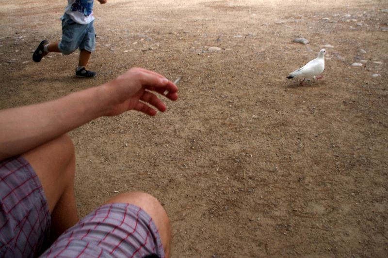 Mi pare un po poco spontanea la posa del soggetto in primo piano, il fumatore, che magari sei tu... sono abbastanza d'accordo con mauro sul fatto che il taglio del bimbo sia un po azzardato, anche se di solito mi affascinano le pose in cui alcuni soggetti sono tagliati. Qui forse sarebbe servita una inquadratura un po più angolata a sinistra, per capirsi: piu vicina al corpo del fumatore, per rendere l'immagine più piena delle gambe e braccio del soggetto in primo piano e poi vedere in secondo piano la divertente e spontanea corsa del bimbo dietro al povero piccione impaurito!