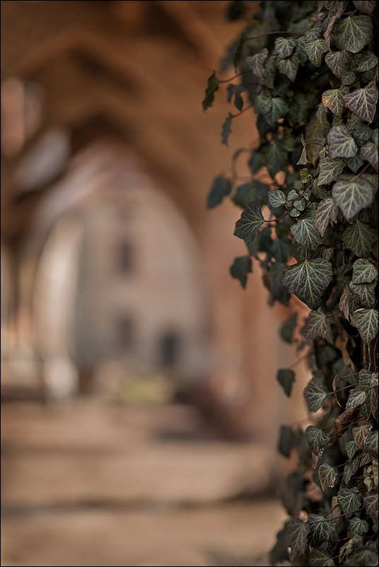 Non so, Pio, a dire la verità a me l'occhio cade inesorabilmente sullo sfondo sfocato dove si intravede il profilo dell'arco; mi devo sforzare per fissare l'edera a fuoco. Forse se un rametto avesse attraversato il campo in zona più centrale, si sarebbe creato un appiglio più facile per l'occhio.