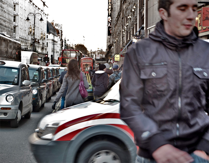 in questo caso alla linea di fuga, mi colpisce la sagoma delle figura femminile di spalle, la sua mano coperta dal guanto nero, poi mi sposto sul bianco del cappuccio del personaggio seguente, rimbalzando sullo sguardo del ragazzo in primo piano a destra: un incognita che apre a diverse interpretazioni, soggettive certo, ma c'é quello sguardo nella composizione rovesciato verso l'osservatore contro la direzione corrente della linea di fuga