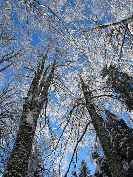 Buonol'effetto di verticalità dell'immagine data dal formato e dalla fuga verso l'alto degli alberi