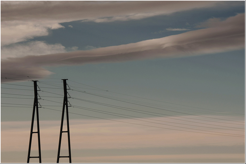 Mi piacciono molto l'effetto grafico e la composizione, che gioca sul divergere dell'andamento dei fili rispetto a quello delle nuvole.