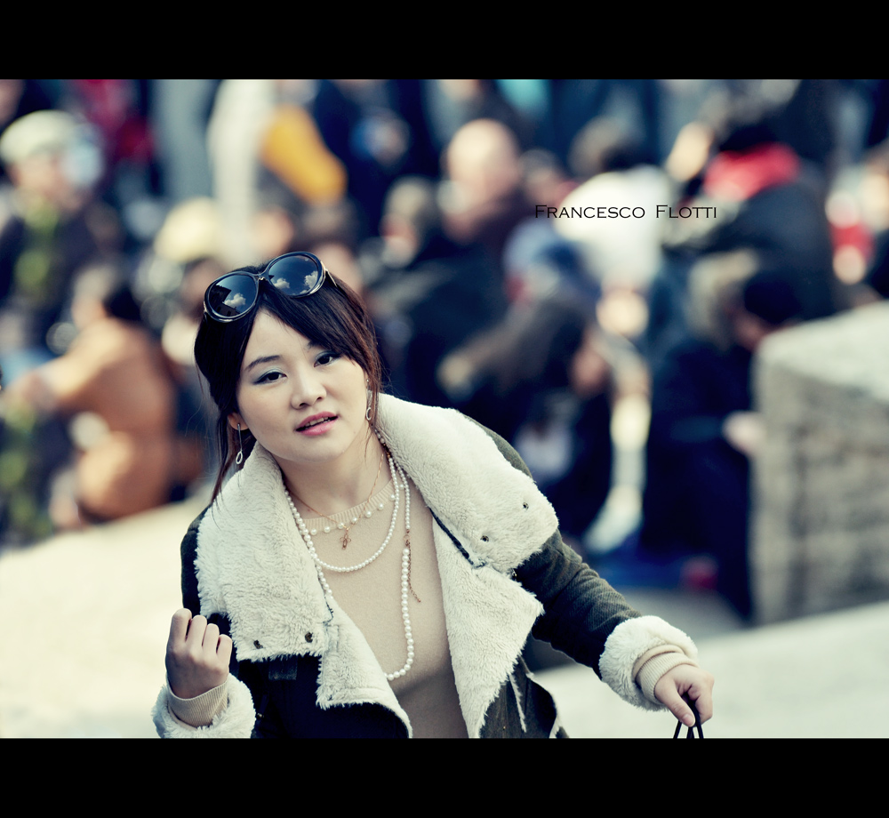 colori e tonalità molto accattivanti. Anche l'espressione mi piace molto. Un trucco in perfetta tinta con lo sfondo ottimamente sfocato. Insomma, sembra una modella "di tutti i giorni" e le nuvole riiflesse sugli occhiali gli danno un pizzico di glamour.....quello che non va, a mio avviso, è il taglio: troppo spazio sopra per cui la ragazza perde un pò il primo piano e risulta essere schiacciata un po' verso il basso e la mano destra che porta quasi sicuramente una busta dello shopping che però neanche si intravede. Comunque già se tagli un pò sopra il tuo nome, a mio parere migliora molto.