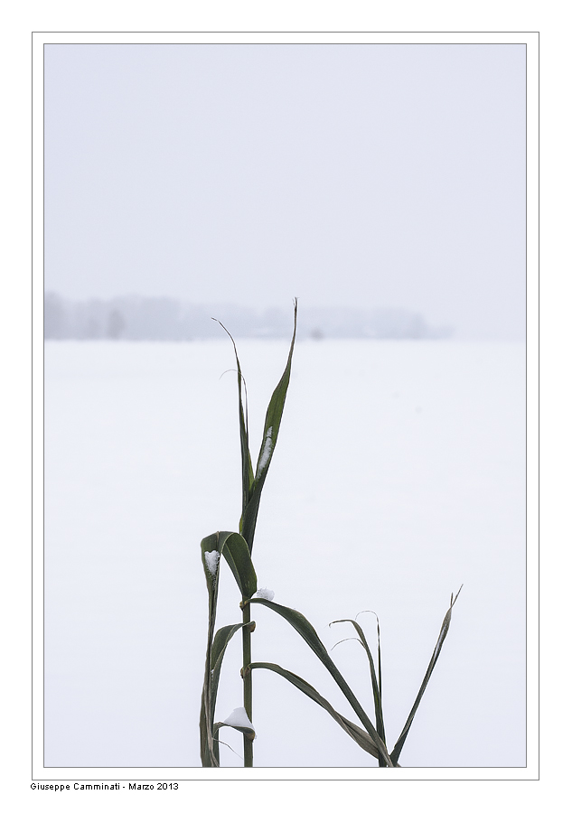 | Un delicato racconto dei recenti silenzi di una Bassa innevata. Verrebbe la voglia di vederne di più di quei gambi residui.