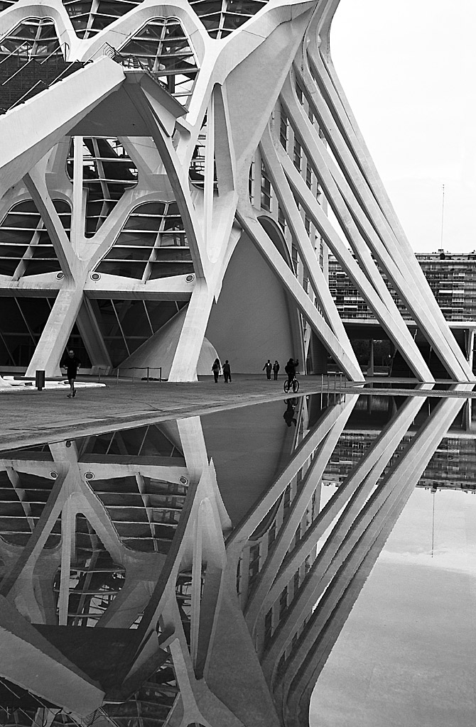 buona l'idea di sfruttare il riflesso dell'architettura nell'acqua.. in tal maniera la scena si completa e si autocostruisce.. mi rimane qualche dubbio, anche qui, sulla scelta di chiudere così tanto il nero.. a tal punto che l'uomo che corre sulla sinistra si confonde con lo sfondo.. e, come nell'altro, il cielo rimane davvero un po' troppo bianco.. e anche qui, mancano un po' le linee verticali assolute..