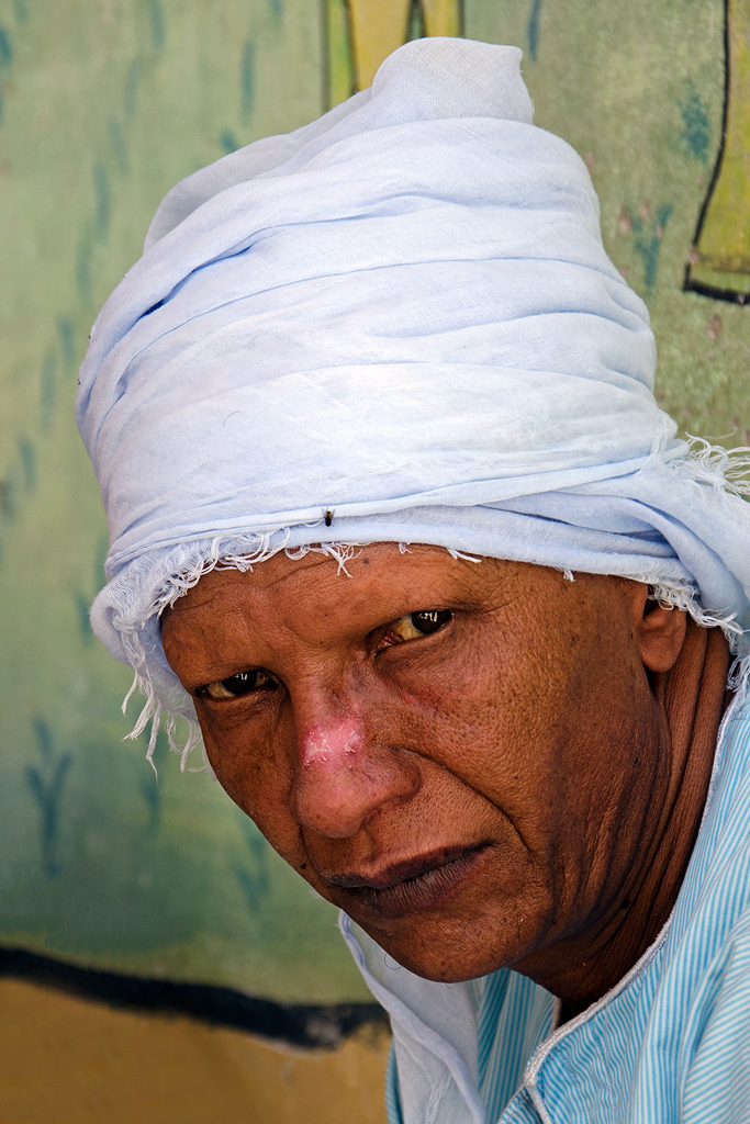 gran bel ritratto, intenso e naturale, bellissimi i colori che così saturi ben si sposano con l'espressione intensa del soggetto, anceh la mosca fa la sua parte. Il turbante ti ha costretto a spostare l'immagine in alto sbilanciandola un po' rispetto alla base, la prossima volta taglialo, quello che conta è il viso.  |