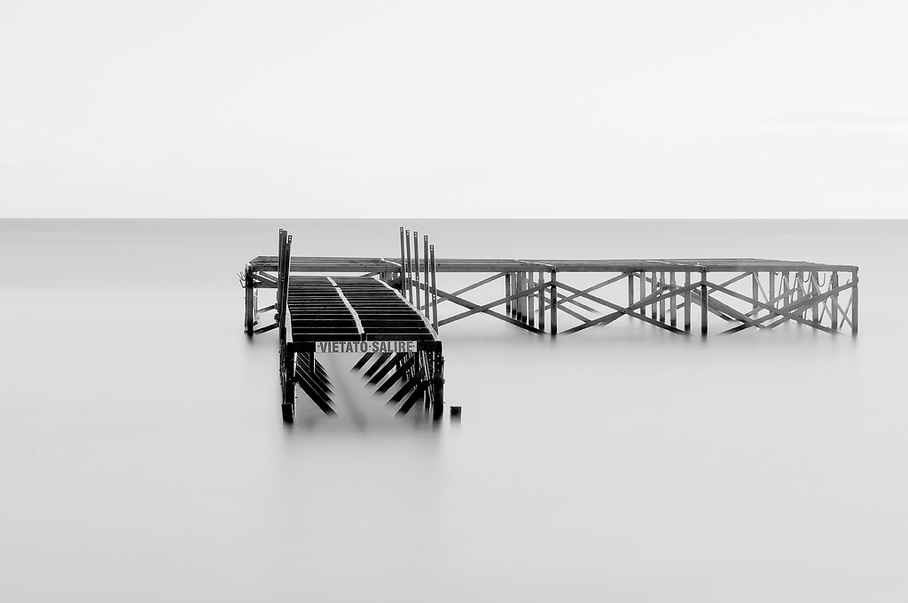 Una bella lunga esposizione che rende il pontile immerso nel niente fumoso. Mi lascia perplesso lo stacco netto tra il grigio del mare ed il bianco del cielo.