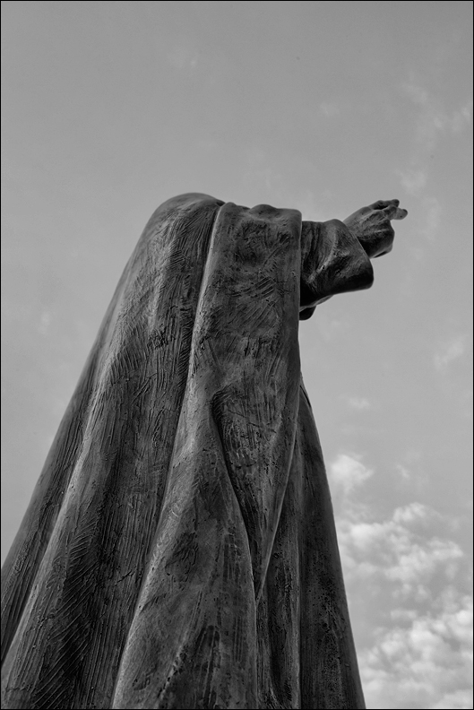 Bel punto di vista, Pio, inusualissimo e che lascia tutta la visibilità al gesto che così spicca dal tronco che ha perduto la testa (da cui truncumque, se ho capito bene). Il b/n (non sospettavo che osassi mai togliere il colore dai tuoi scatti ) funziona molto bene sulla materia della scultura, meno, secondo me, sul cielo dove vince la tua tendenza ai toni delicati.