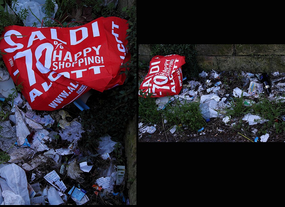 Cercavo di fare dell'ironia: saldi, ma di cosa? Delle cartacce e dell'immondizia! Non si è capito ed allora è evidente che ho fallito e quindi resta solo il "solito" significato di denuncia per il quale effettivamente sarebbe bastata una sola foto. Ne ho messe due perché indeciso fra verticale e orizzontale e perché in quella verticale si leggeva meglio la parola Saldi funzionale al significato che vi avevo visto e che intendevo comunicare, senza riuscirci.