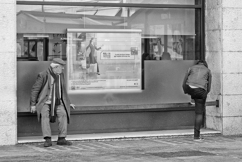 Una street che mi piace molto. Mi immagino lo sguardo dell'anziano che va alla ragazza sulla destra, rinforzato dal cartellone che rappresenta una corsa: l'occhio va veloce verso la destinazione. Ok!