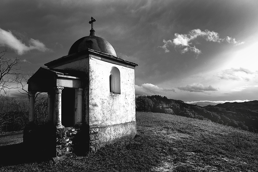 foto interessante , mi piace come hai ambientato la chiesetta , avrei dato piu' respiro a dx si intravede qualche albero , sul b\n lo trovo ben riuscito nella scala dei grigi , ma hai bruciato la parte bianca accanto alla finestra "almeno credo " , mentre le ombre sono troppo chiuse sull'ingresso ....