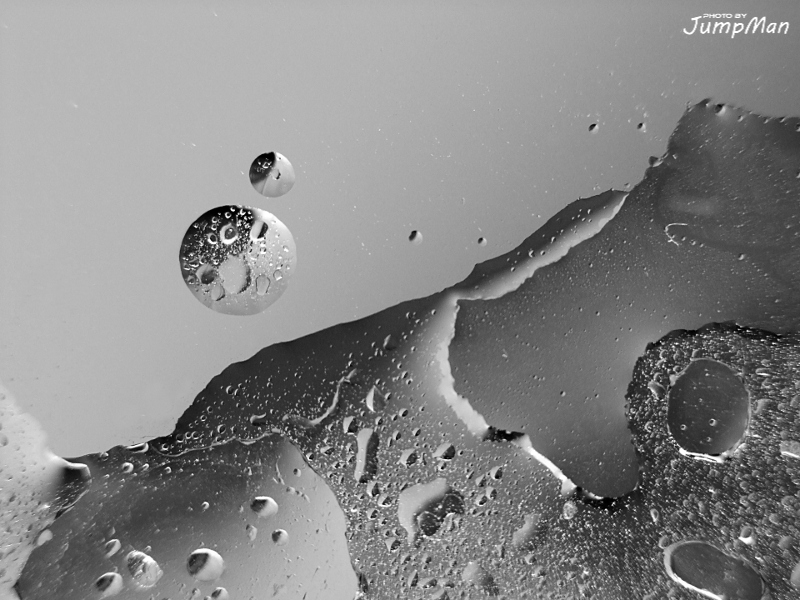 Gocce d'olio e acqua su piano in cristallo appoggiato su libri con CD sotto e luci led varie, lente macro.