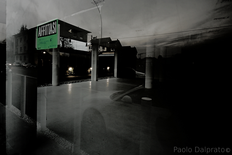 Ben vista la sovrapposizione del cartello sull'edificio e la sovrapposizione di piani; mi piacciono le tonalità e la parziale desaturazione (?) che circonda il medesimo...inoltre trovo azzeccata l'ampia zona nera di dx, da cui sembra uscire in corsa l'auto riflessa...non so se era ferma o in movimento, ma hai costruito l'immagine in modo da rendere bene l'idea di una specie di 'fuga' dal buio...insomma, mi piace  |