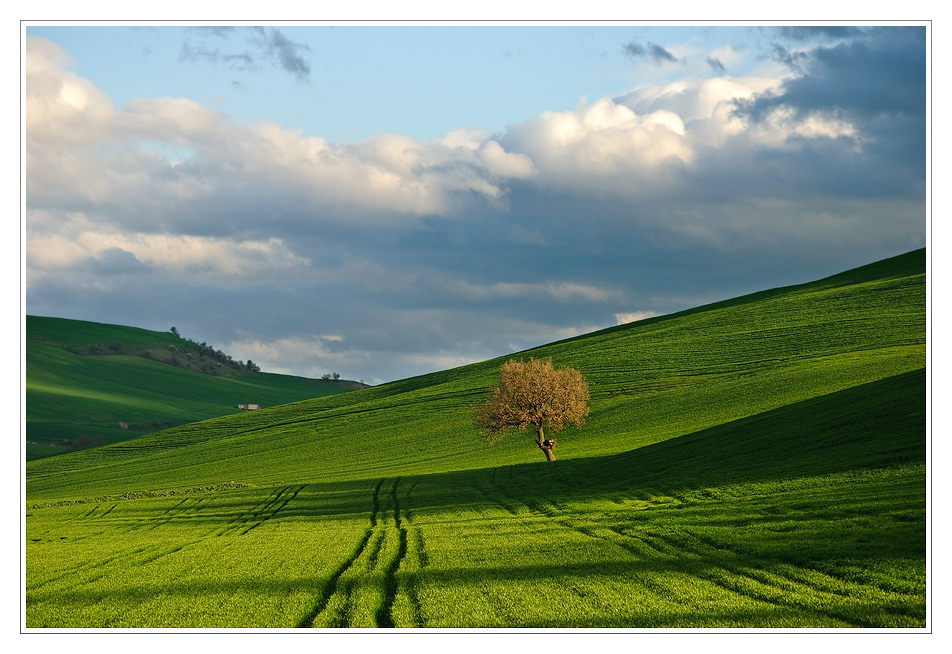 Il verde di questo periodo, valorizza alla grande gli scatti di campagne e prati che in questa stagione ci viene regalata da madre natura abbondantemente. E quando si sa sfruttare la buona luce della mattina o sera, e le linee e forme della terra come hai fatto tu ci vengono regalati bellissimi scatti come questo. ciao Giuseppe  _________________ ' E' un'illusione che le foto si facciano con la macchina... si fanno con gli occhi, con il cuore, con la testa '' Henrì Cartier Bresson