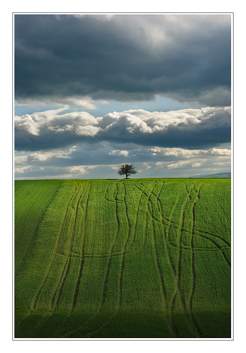 Un cielo dalla pregevole tridimensionalità incombe su un paesaggio dalla composizione minimale ed illuminato da una fantastica luce. L'alberello, pur piccolo, si vede e come...grazie alle linee del campo che ad esso conducono (giusto per confermare che non sono le dimensioni che fanno apprezzare il soggetto di una foto.)
