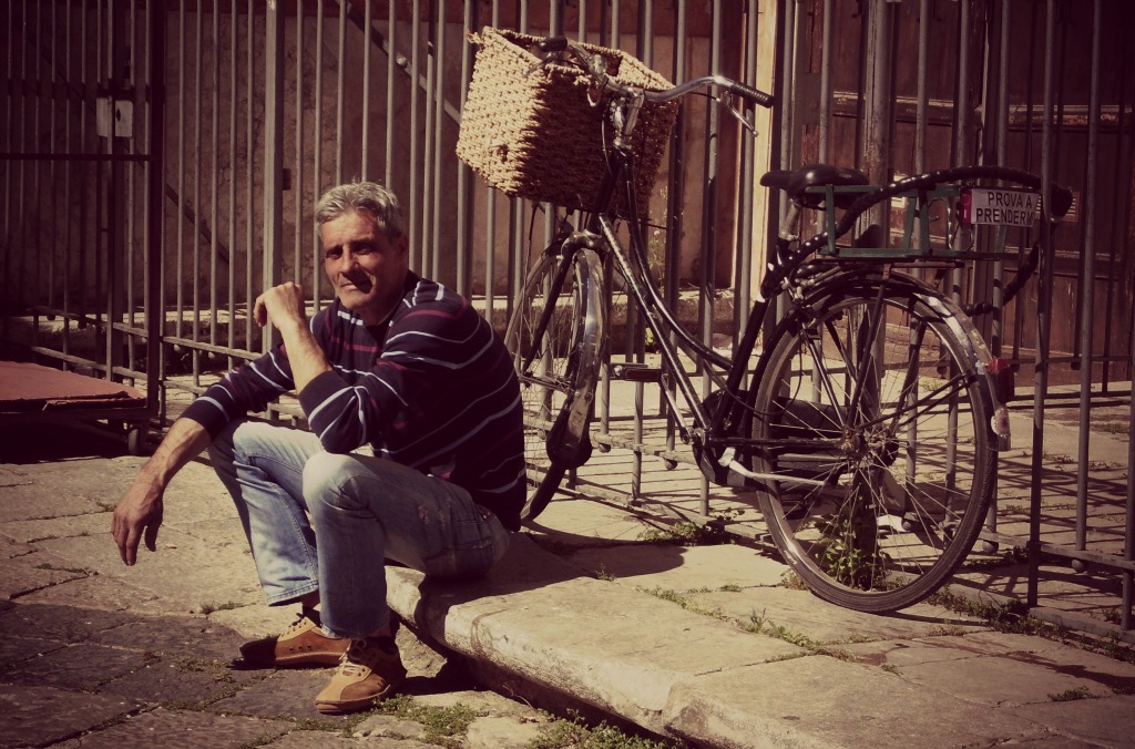 Se osservi bene la foto, noterai che che nel retro della bici sopra la ruota c'è una targhetta con scritto "Prova a prendermi", e il titolo "ti ho presa" è il pensiero o l'affermazione a seconda da come si vuole interpretare "riferito alla bici" da parte del signore.. con aria molto soddisfatta eheh