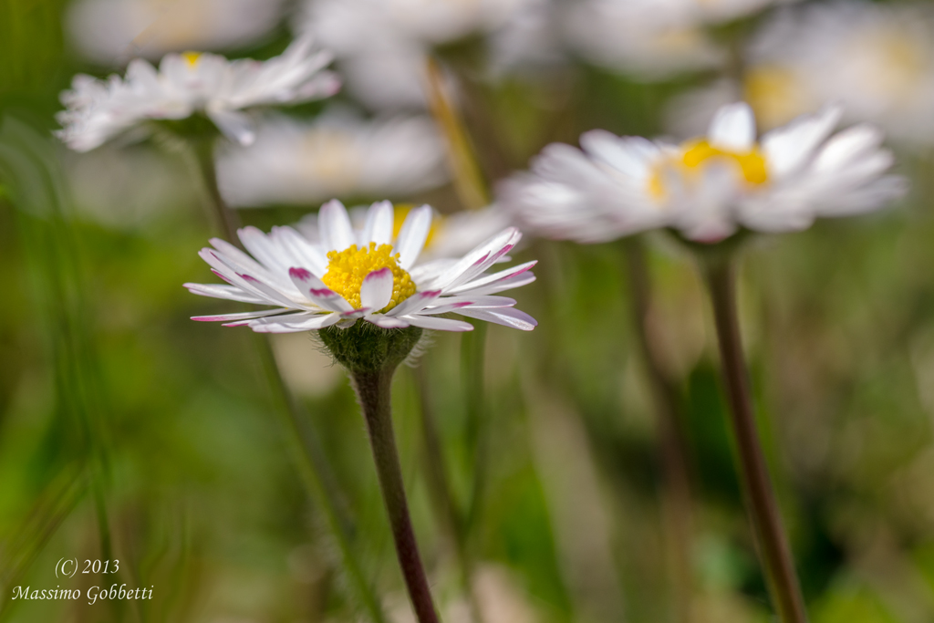 Bella immagine con magnifica messa a fuoco sulla prima margherita, di cui si vedono assai bene anche i particolari del capolino. In effetti lo sfondo - specie in basso - disturba un po', come contropartita al vantaggio di avere una maggiore profondità di campo. Dal punto di vista compositivo la foto appare come un po' mozza dalla parte superiore; forse sarebbe stato meglio inquadrare un po' meno gambo e aprirsi un po' di più in alto. Opinione personale, naturalmente.
