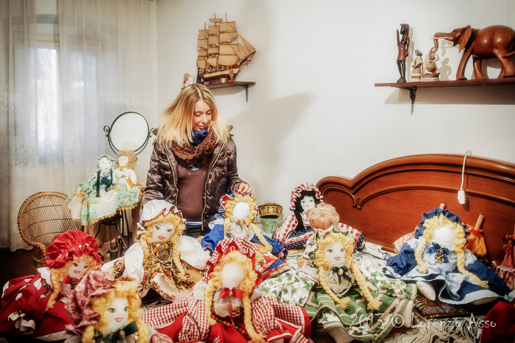 Mi rendo conto che avrei dovuto trovare senz'altro il modo di inserire qualcosa che ci collegasse direttamente alla protagonista ma non sono stato capace di pensare a niente lì per lì (pensa che passeggiavamo per una via di Castiglione con Valentina - che vedi qua ritratta - e c'era la sig.ra Emilia sull'uscio di casa. Ci siamo messi a parlare casualmente. Poi ci ha invitato in casa " a vedere le sue bambine"...ci ha spiegato come le realizza - per piacere - e indubbiamente chiunque è colpito dall'assenza del volto - pensa per lei era normale dato che il volto lo fa dipingere a parte da una sua amica - Ho fatto anche dei ritratti più significativi a lei ma mi ha chiesto di non essere pubblicata. E, per quanto non credo che passerà mai di qua, voglio assolutamente rispettare la sua richiesta - se ti interessa ti posso girare qualche scatto in privato - E quindi ho voluto in qualche modo "ritrarre" il suo ambiente, tutto ciò che in fondo la caratterizza, mentre Valentina sbirciava, come un pesce - a cominciare dall'abbigliamento - assolutamente fuor d'acqua in quello specifico contesto ).