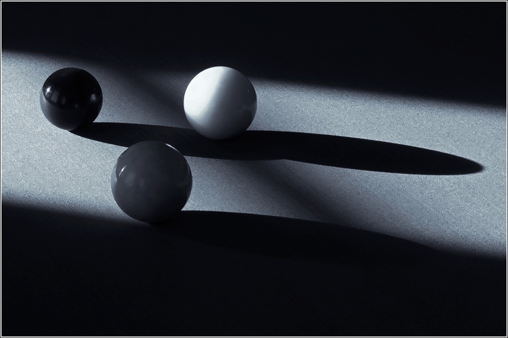 questa foto nasce in modo del tutto casuale. In visita ad una villa di cui ho già postato un'immagine, dove sono vietati scatti fotografici all'interno, ho rubato letteralmente alcune foto mentre la guida era distratta. Il biliardo è in una sala con finestre schermate da pesanti tende, e le bilie nella posizione in cui si vedono erano illuminate da questa lama di luce radente che proiettava sul tappeto l'ombra allungata. Questo mi ha colpito e ho scattato, poi con un crop e la conversione in bn ho cercato di dare un senso compiuto allo spunto iniziale che mi sembrava interessante per il gioco di luci e ombre.