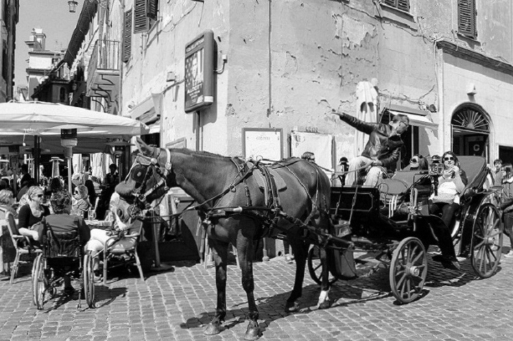 Non so quanto sia comune il termine "carrozzella" per indicare quel veicolo trainato da cavalli (dalla Treccani: "2. A Napoli, Roma e in altre città, carrozza in servizio pubblico di piazza, per passeggiate, a 4 ruote e a un cavallo, aperta e con copertura a mantice."). E, come dici, quella a sx si confonde un po' con lo sfondo.