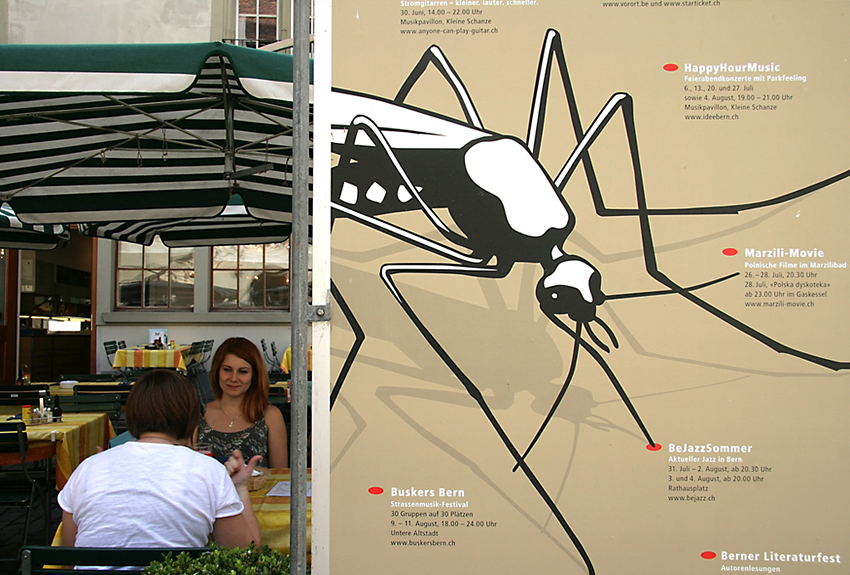 mi piace come intereagiscono l'insetto cartonato minaccioso, con gli umani ignari seduti al tavolino. Le trame dell'ombrellone costruiscono quasi una soluzione di continuità con l'insetto, unendo i due frames.