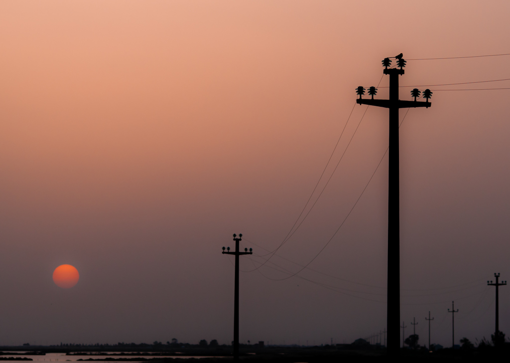 Non il solito tramonto. Molto interessante la disposizione degli elementi. L'avrei vista benissimo in un taglio quadrato e la composizione limitata ai due tralicci più grandi e al sole.