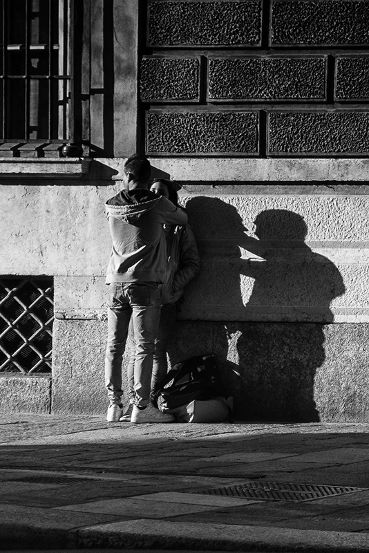 Lo spirito di questo amore giovane, materializzato in un'ombra doppia, ad accompagnare la realtà dell'abbraccio. Grande occhio per cogliere il momento, e bella confezione in un bianco e nero ben condotto.