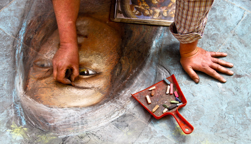 Secondo me le mani sull'asfalto possono solo suggerire la posizione assunta,(non credo che si possa disegnare con le gambe in aria ..eheh...)in secondo luogo ti assicuro che un disegno del genere ha bisogno di tempo per essere eseguito ...comunque grazie dei consigli