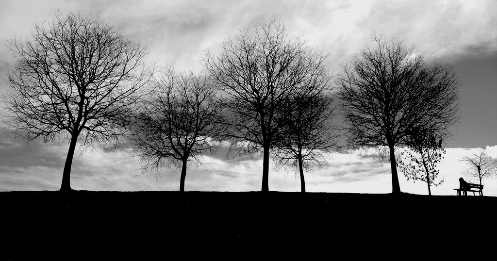 Molto bella. La maestosità di questi alberi rivolti verso l'alto in cui l'uomo seduto sulla panchina trovo conforto, gli permettono forse di fare silenzio dentro di sé e di riflettere, un posto dove stare in pace, soli appunto. Forse se l'uomo fosse stato un po' più centrale.. si fa un po' fatica a inserirlo nella contemplazione della foto.