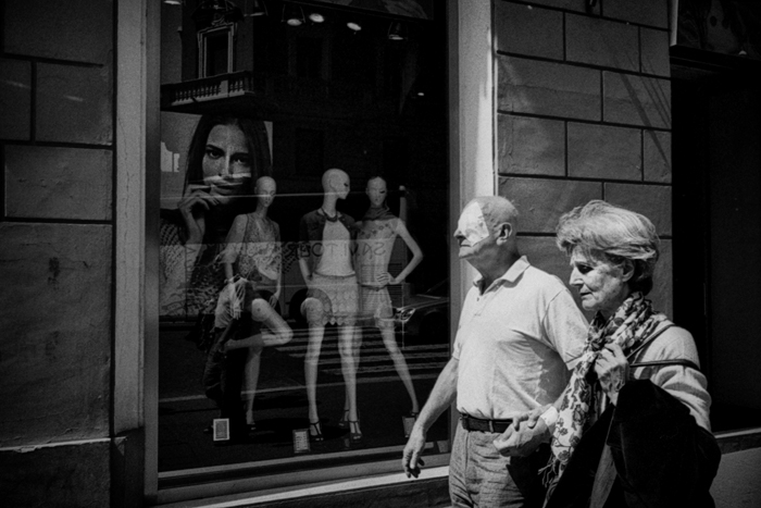 Ci trovo un richiamo a "Le regard oblique" di Doisneau: anni dopo, la moglie ha preso provvedimenti e un paraocchi per il consorte...