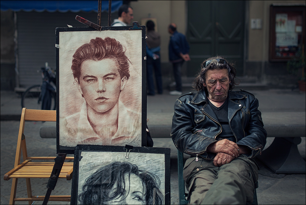 Il fatto che l'autore dei ritratti sia un po' male in arnese, che si sia anche addormentato nell'attesa di un cliente ce lo fa guardare con simpatia, viene da pensare he spesso non basta essere bravi per ... sbarcare il lunario.
