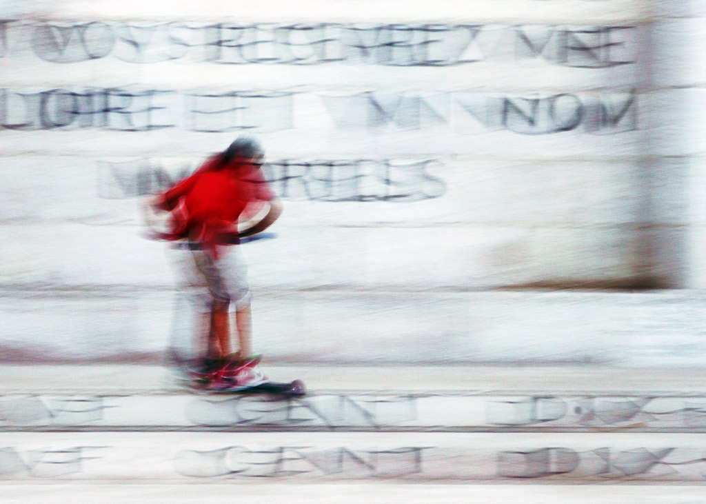 E' già da un pò che guardo con attenzione questo genere di foto.La mia non segue troppo le regole,lo riconosco ,ma è stato semplicemente qualcosa che mi ha emozionato:un movimento , una pennellata ,un frullo ,un volo ..chissà. In realtà un ragazzino che stava skettando ed indossava una maglietta rossa Le scritte incise sul fondo in marmo bianco hanno fatto il resto(oltretutto era il monumento ai caduti per la patria!)