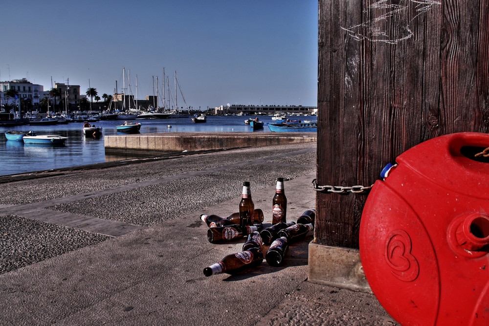 Non era nelle mie intenzioni (questa volta) fare una "foto denuncia", tanto vero che l'ho anche postata in Paesaggio e non in Varie, o Reportage. Persino il titolo, per quel che conta (poco, per me) non fa alcun riferimento al degrado e all'inciviltà. Effettivamente la boa rossa la si può considerare un co-soggetto insieme con le bottiglie, ma poco importa: co-soggetto, o quinta, o l'uno e l'altro insieme, a me piaceva quella "cosa rossa" ingombrante in primo piano e così mi è piaciuto scattare. Tutto il resto è (per me) questione di lana caprina