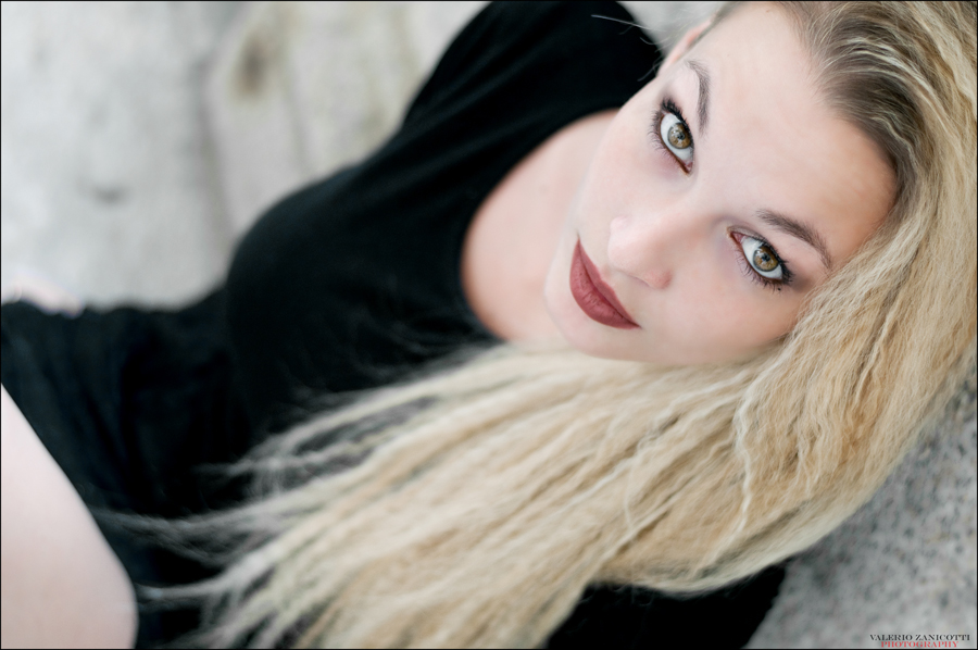| In effetti la gamba (che a prima vista mi è sembrato anche un braccio) un po' da fastidio personalmente, ma questo non toglie nulla a questo bellissimo scatto in cui lo sguardo intendo della modella attira chiaramente l'attenzione dell'osservatore. Molto bello anche l'angolo di ripresa ed impeccabile la realizzazione tecnica, bravo.