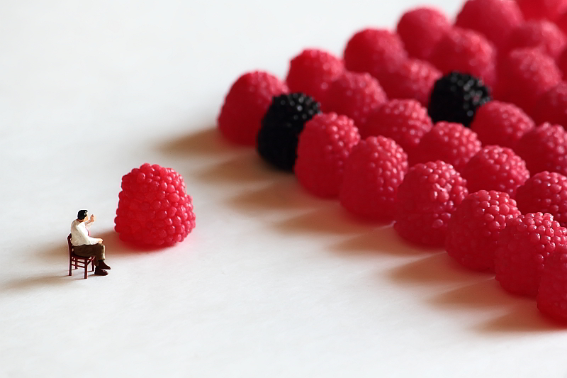 Nel caso di miniature meno caricaturali, aspecifiche e/o che rimandano a contesti più impegnati, la costruzione necessita di una mia idea ad hoc ed originale. In questo caso ovviamente "ci sono anche io dentro la foto", ma non credo riuscirei a farla diventare una regola perchè foto di questo tipo sono estremamente impegnative. Ad esempio ho delle miniature sulle quali sto ragionando da settimane perchè non so come fotografarle. Non le posso mettere sulle fragole, sui pasticcini o i kiwi.
