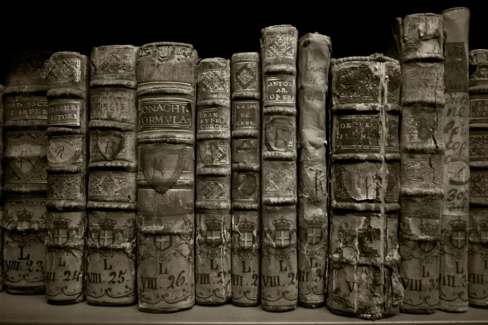Quello che vediamo è una serie di libri del '500 in vario stato di conservazione (ma neanche pessimo, direi), ripresi con una illuminazione frontale, resi con un bel b/n brunito. Sicuramente efficace la resa materica delle superfici come pure l'atmosfera in cui hai immerso i protagonisti. Per il resto... non saprei...