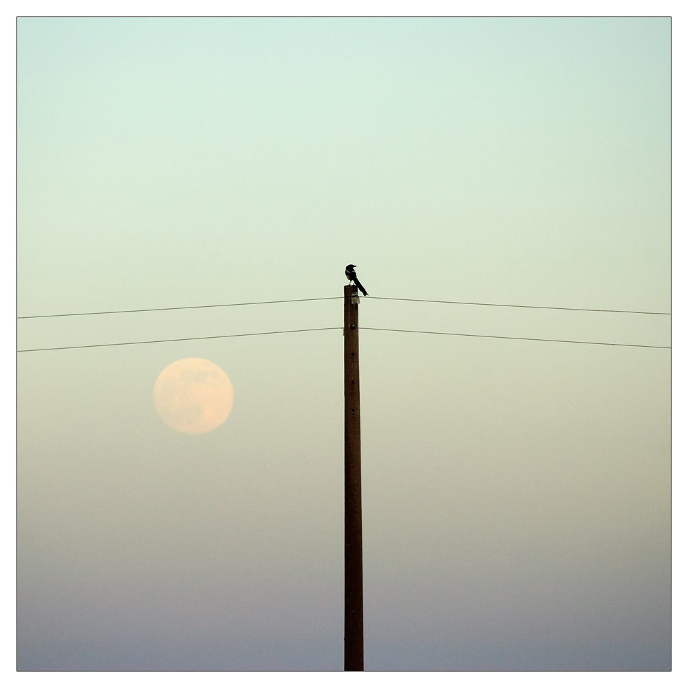 E' il genere di foto davanti alla quale non so mai restare indifferente. Ma qui oltre alla bellezza essenziale e grafica di linee molli di cavi e del grandissimo globo luminoso, c'è il piccolo volatile, il suo profilo fra la parti. E , come notato dagli altri amici nei commenti, la cattura acquista punti e densità emotiva.