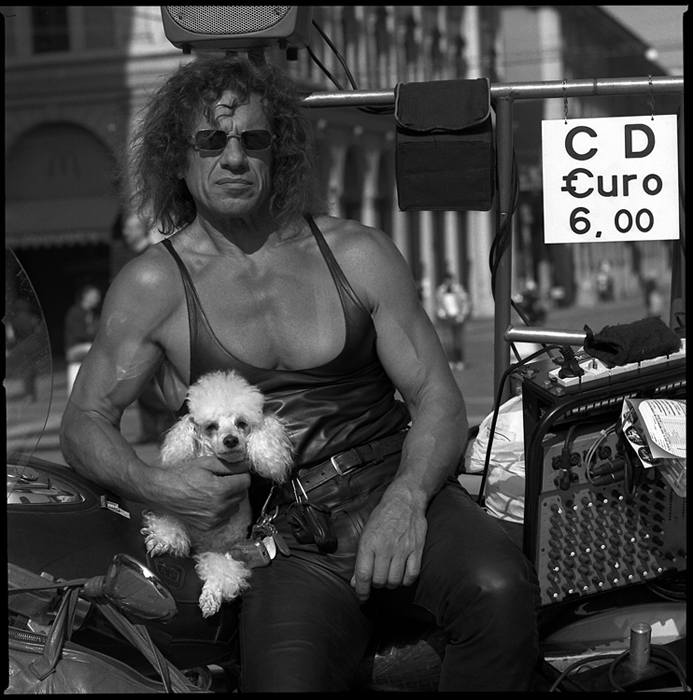 Ero in piazza Maggiore con altri amici fotoamatori, e questo tipo, ricordo si chiama Peppe o Beppe, era lì, muscoloso con quell'assurdo cane che contrastava in maniera incredibile col soggetto, su una grossa moto con un amplificatore (spento) ed una serie di CD.