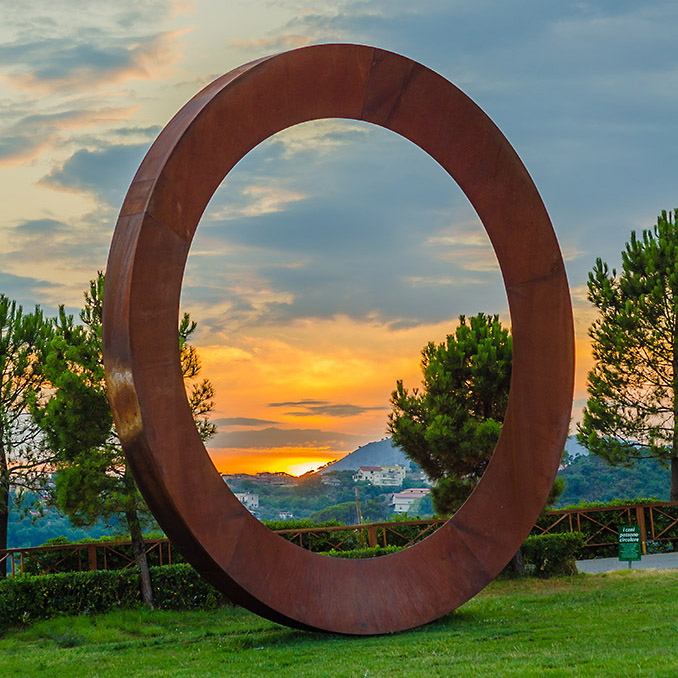 Forse il punto chiave è quello di decidere se il cerchio sia il soggetto da cui si parte per vedere anche il resto (soggetto che prende tutto il fotogramma con il sole), oppure se nel paesaggio circostante sia presente un cerchio (paesaggio nel quale è presente un cerchio, scatto piu largo).