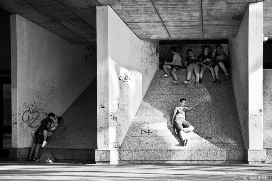 Grandissima "scena", teatrale,quasi...finta ! Peccato per le imperfezioni tecniche (bruciature e nitidezza). Anche per me, nonostante le tue giustificazioni, sarebbe stato meglio stringere un po' di più (o rifilare in basso e ai lati). Una piccola considerazione: mi riconosco più sui ragazzi di dx che su quelli di sin (purtroppo o forse no...). Quando avevo la loro età, all'uscita di scuola, le ragazzine non si stendevano per terra...pubblicamente!  _________________ Ilio |