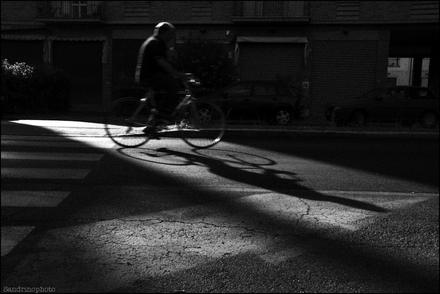 Tutto quello che compare nei due terzi inferiore va bene: la lama di luce, l'ombra beccata al momento giusto rispetto a quella, la segnaletica che crea ulteriori motivi grafici, la matericità dell'asfalto...