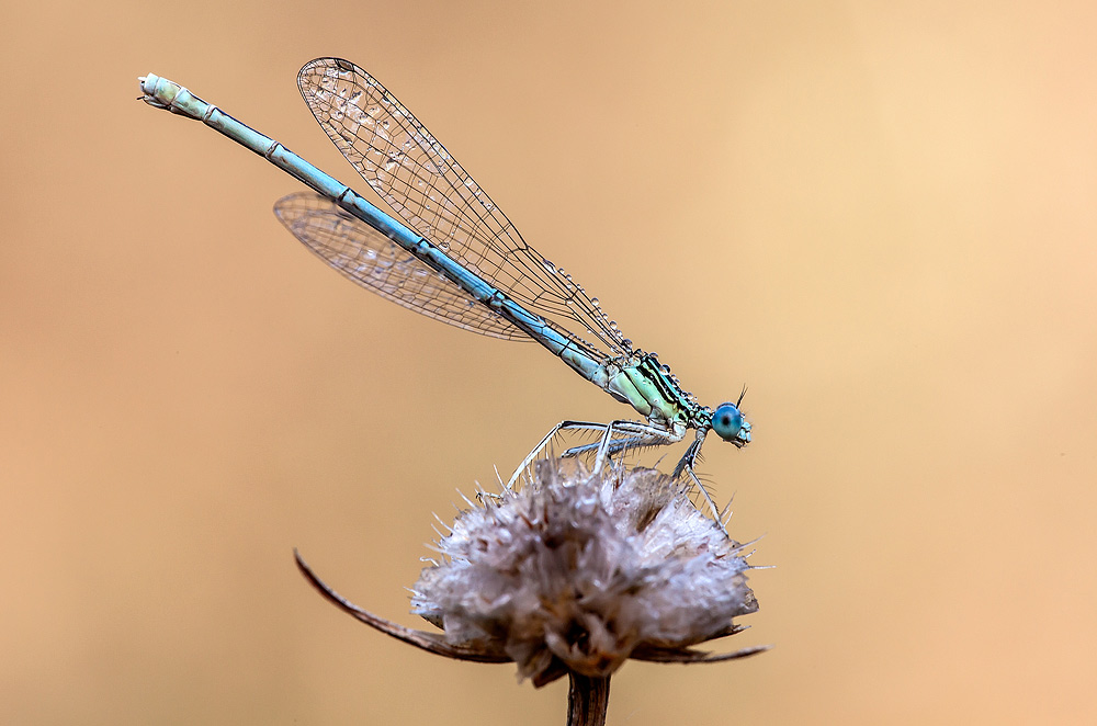 Non è mai semplice....diceva un caro amico...neppure il caffè..., la giusta quantità di rugiada regala il piacere di vedercela sopra...laciando margine per non inficiare il dettaglio sul soggetto...la morfologia del posatoio ricopia la forma della Damigella...una bella fotografia...complimenti, una buona serata Pierluigi.